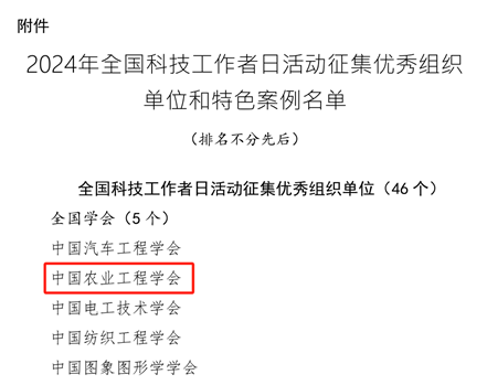 为深入学习贯彻习近平新时代中国特色社会主义思想,生动展现农业工程科技工作者报国为民的风采,2024年5月30日第八个“全国科技工作者日”期间,我会以“弘扬科学家精神,勇当高水平科技自立自强排头兵”为主题组织开展了弘扬科学家精神、为科技工作者送祝福、科技志愿服务、学术交流研讨、主题党日活动、慰问老科技工作者等6类共18项有特色有效果的科技活动,党建与科技工作者日融合,学会党委、秘书处党支部、分支机构党的工作小组、理事党员、理事、分支机构、地方学会、会员单位、会员等全面参与,服务广大会员效果显著,有力推动了全国科技工作者日的影响力覆盖面直达基层一线,在全社会营造了支持科技事业、爱护科技人才的浓厚氛围。